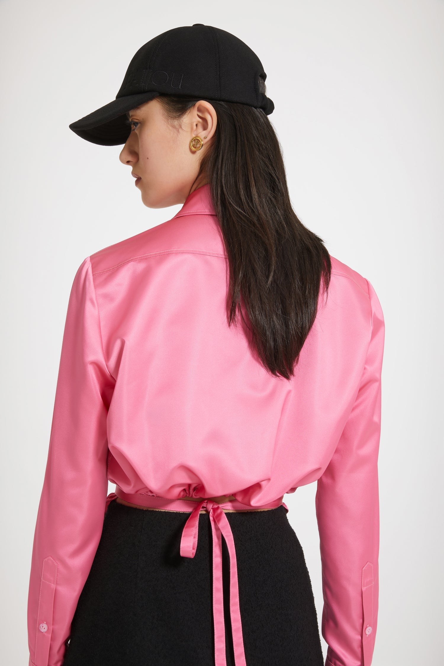 リサイクルポリエステルを使用したホットピンクのサテンシャツ。丈の短いシルエット。サイドにバイオリンシェイプのカットアウト。隠しボタン留め。ウエストにベルト、後ろにトンネル。袖口にプリーツ。袖口にボタン付き。